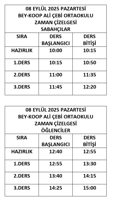 08.09.2025 PAZARTESİ GÜNÜ OKULUMUZUN DERS GİRİŞ-ÇIKIŞ SAATLERİ